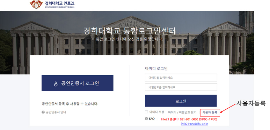 2) 처음 접속하는 경우 경희대학교 인포21 ‘사용자등록’ 필요
