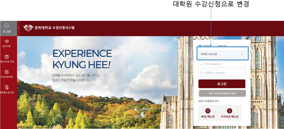 가) 경희대학교 수강 신청시스템 접속(http://sugang.khu.ac.kr)